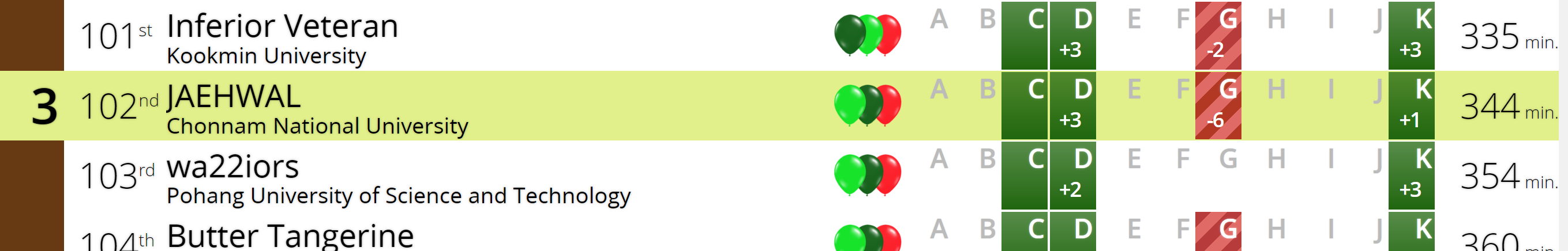 늦은 3솔에 패널티도 덕지덕지라서 등수는 낮았는데 대회문제들 난이도가 쉽지않았던 것 같다.