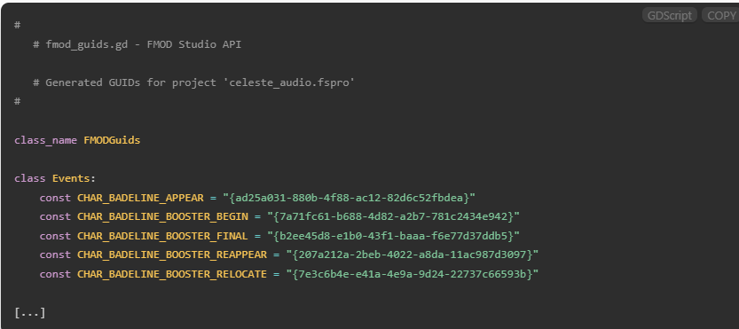 "FMODGuids.Events.Song" 형태로 사용할 수 있다.