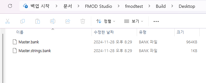 "~~~~\FMOD Studio\fmodtest\Build\Desktop" 이런 주소에서 Master.bank (본인이 설정한이름) 파일이 나온다. 우리가 필요한 파일은 이 파일이다.